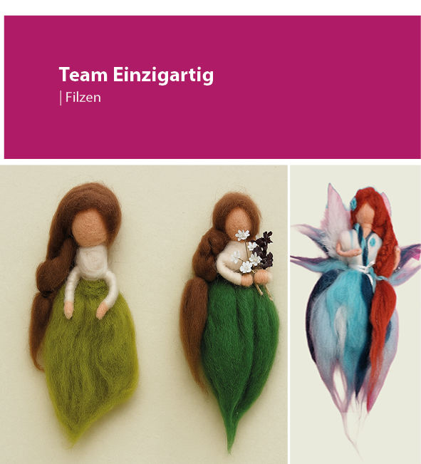 Das Filzen mit der Nadel bietet eine wunderschöne Möglichkeit lebensnahe Figuren zu formen. In diesem Seminar wird eine wunderschöne Fee gefilzt. Bunt und farbenfroh. Die intensiven Farben der Filzwolle und ihre Beschaffenheit regen dabei sowohl die